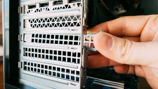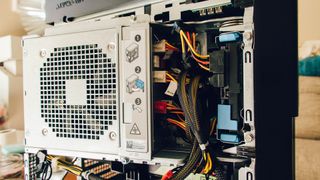 It might look complicated, but the only trick to it is undoing the two switches that this panel in place. From there, you can swing out the PSU back and forth effortlessly to reveal the rest of the hardware including the processor, graphics card, motherboard and memory. And on the back are three expansion slot covers that easily slip right off.